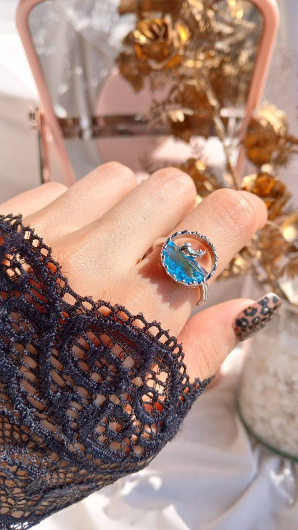خاتم بلاتين أنيق بحجر أزرق بحري دائري، يتميز بتفصيلة دقيقة
