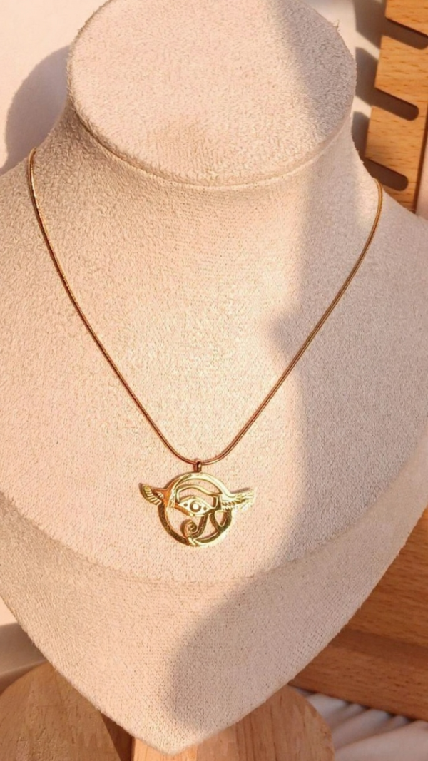 سلسلة ذهبية ناعمة تحمل دلاية كبيرة على شكل عين حورس مجنحة بتصميم فرعوني