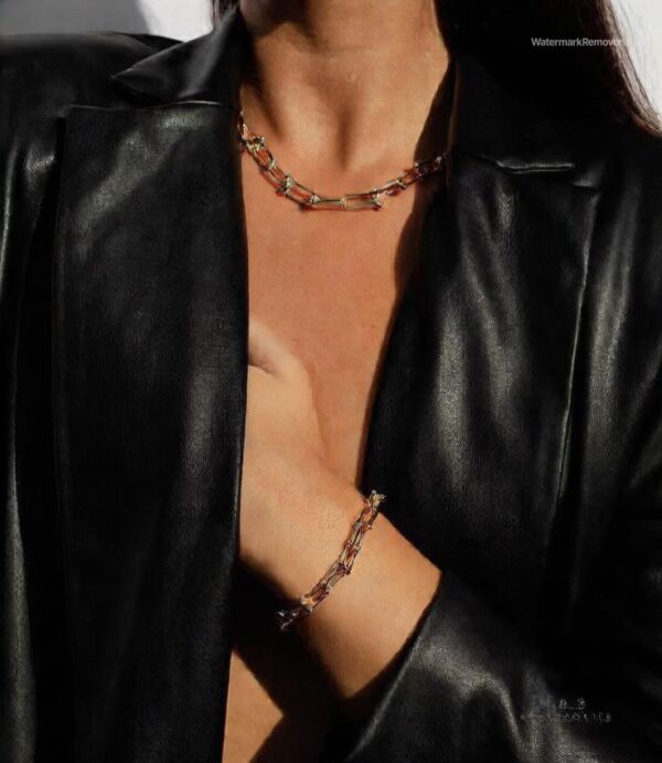 طقم ذهبي اللون بتصميم حلقات مشبكية سميكة (  Link design)، يضم عقد شوكر قصير وسوار مطابق
