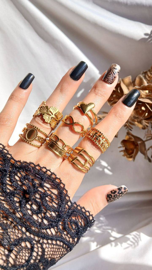 مجموعة من سبعة خواتم عصرية باللون الذهبي بتصاميم مختلفة (منها أوراق شجر، وشكل قلب، وعلامة اللانهاية، وسلاسل)