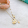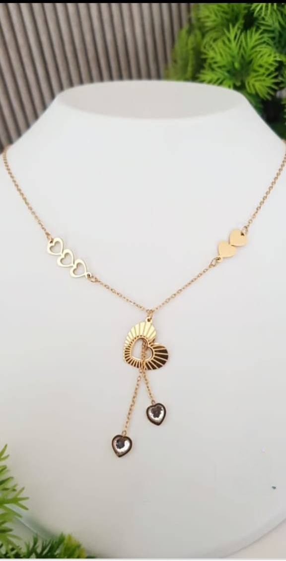 سلسلة رقبة مطلية بالذهب مزينة بتعليقات متفرقة على شكل قلوب، وقلادة مركزية متدلية على شكل قلب مزخرف