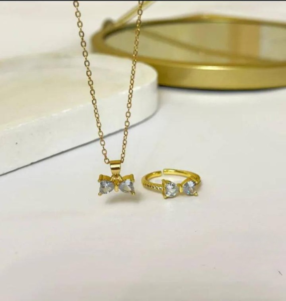 سلسلة + خاتم مطلي بالذهب وكلاهما مزين بتفصيلة فيونكة مرصعة بحجري زركون