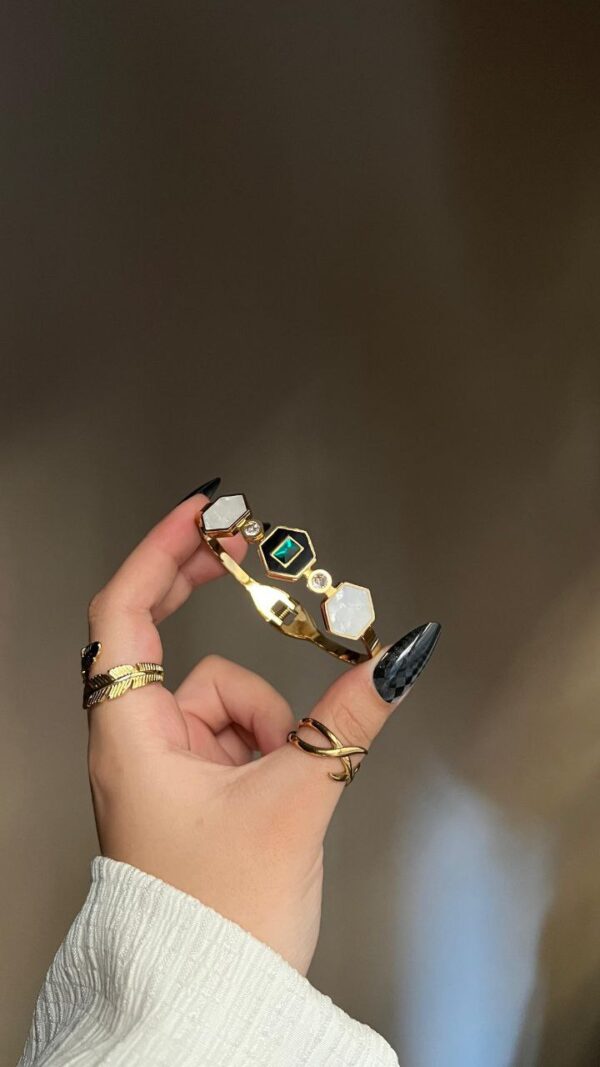 إسوارة مفتوحة مطلية بالذهب تتوسطها أحجار سداسية الأضلاع بيضاء وخضراء محاطة بفصوص صغيرة لامعة