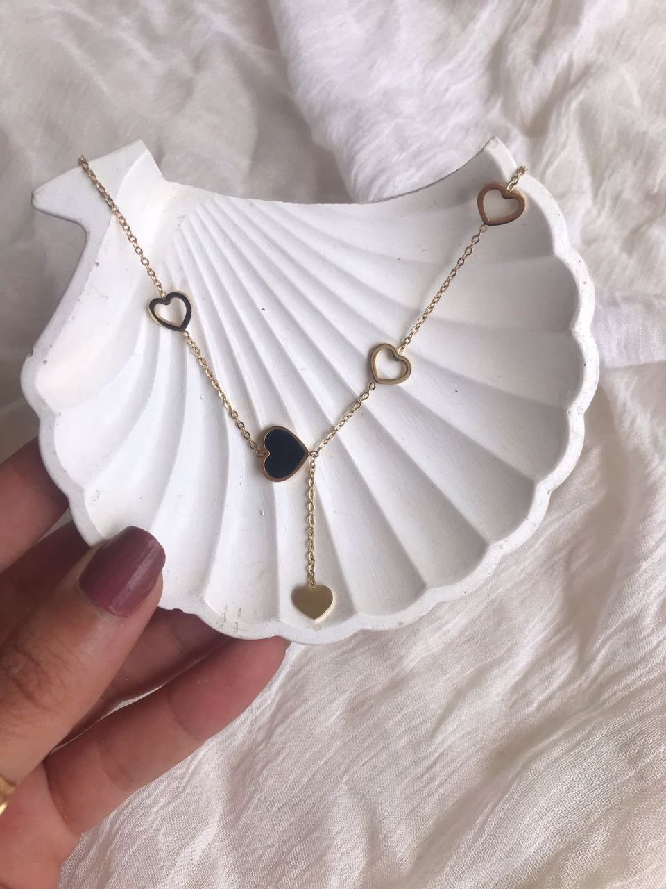 سلسلة رقبة رفيعة بلون ذهبي مزينة بقلوب صغيرة متباعدة على طول السلسلة