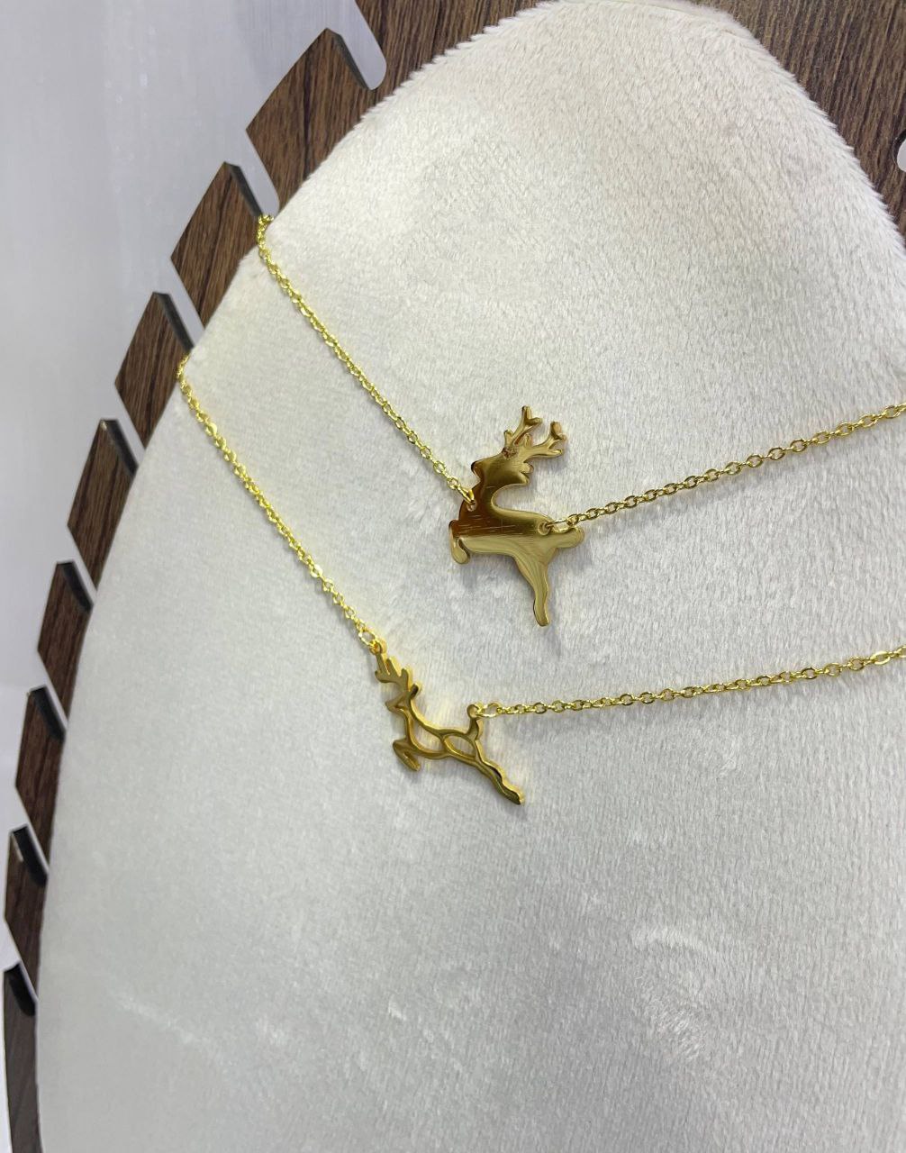سلسلة رفيعة يتدلى منها حلية صغيرة مصقولة ومفرغة على شكل غزال