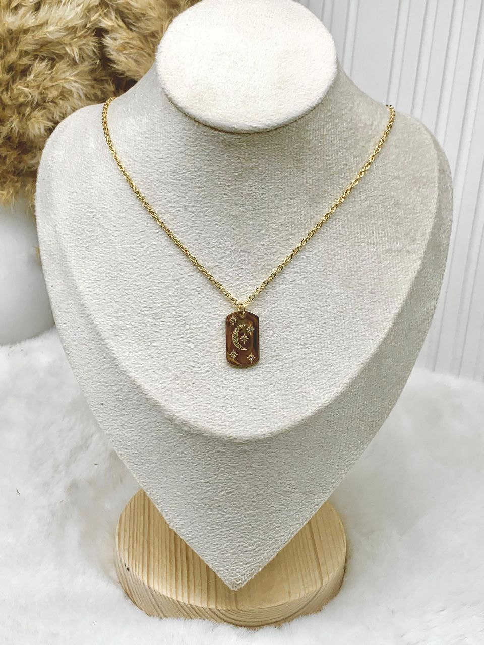 هذه سلسلة مطلية بالذهب بتصميم حبل (روب تشين) مع قلادة مستطيلة بلون بني مزينة بنقوش هلال ونجوم لامعة