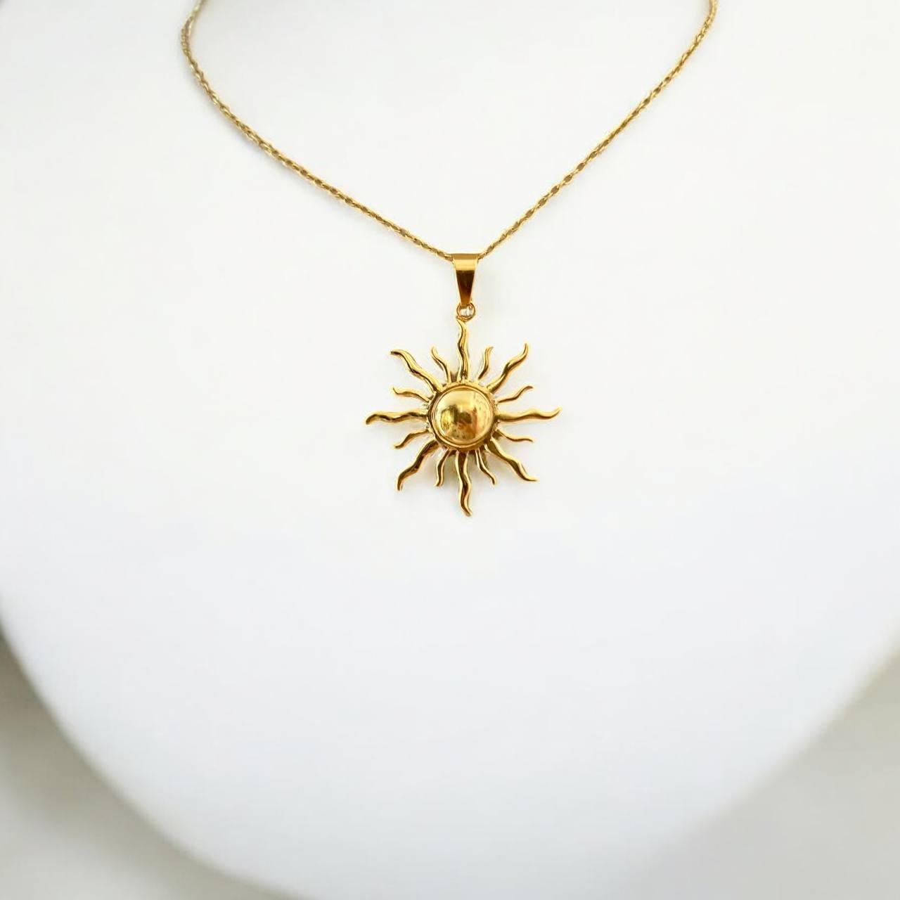 سلسلة ذهبية رفيعة مع قلادة كبيرة ومفصلة بتصميم الشمس المشرقة
