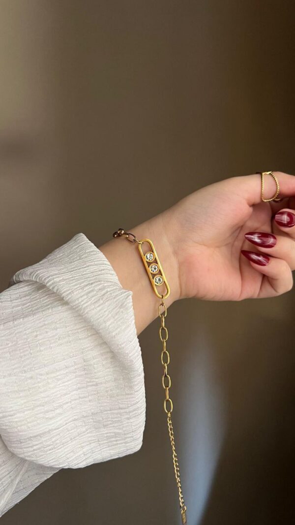 إسوارة مطلية بالذهب بسلسلة من وصلات بيضاوية عريضة، تتوسطها وصلة مستطيلة مرصعة بثلاثة فصوص لامعة