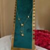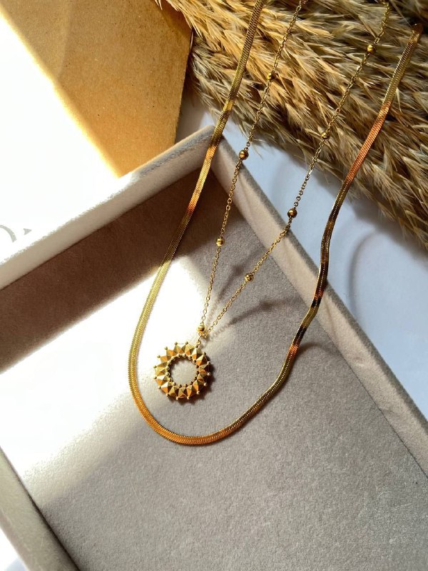 سلسلة مطلية بالذهب بتصميم من طبقتين، تتكون من سلسلة ثعبانية عريضة وسلسلة رفيعة مزينة بكرات صغيرة وقلادة على شكل حلقة شمسية مدببة