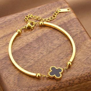 اسوار مطلي بالذهب يتميز بوجود وصلة مرنة على شكل سلسلة تمديد، ويحتوي على حِلية مركزية بشكل زهرة البرسيم رباعية الأوراق باللون الأسود( الترند )